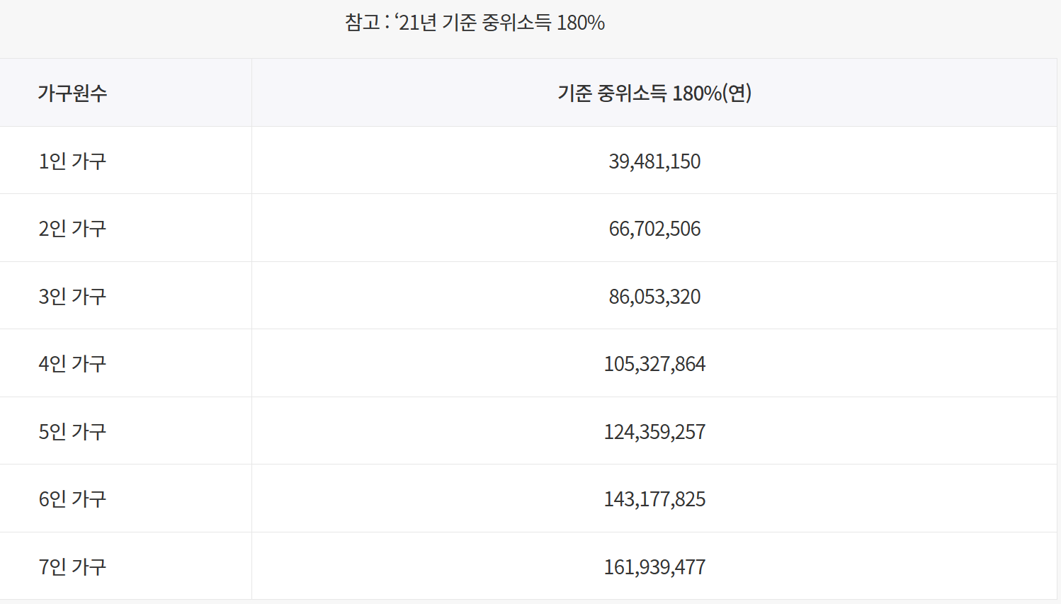 가구원 수에 따른 기준 중위소득 180% 이하에 해당하는 자