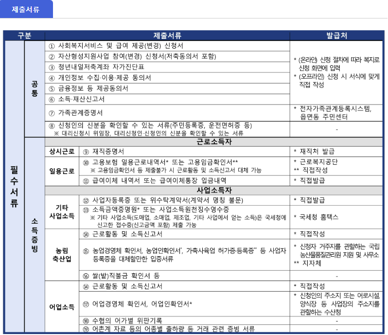 ☞ 제출서류는 자산형성지원사업 신청자 가구의 근로·사업소득, 소득인정액 확인 및 심사를 하기 위한 자료입니다.